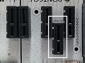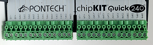 The H-Bus is a 18 pin (2×9) 0.1“ center header that connects to a bus that sits in the DIN rail that allows other H-Bus enabled devices to communicate with each other with simplified wiring. Only 9 of the 18 pins are utilized by the Quick™ mother board. (+VIN, +5V, GND and 6 pins that go to the KardCom )