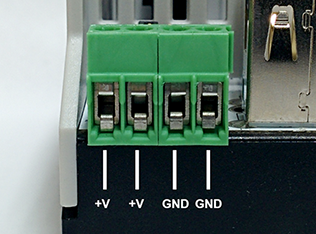 Four pin connector screw down connector, two parallel inputs for +24VDC and two parallel inputs for ground. Its only necessary to connect a single ground and single +24VDC input.