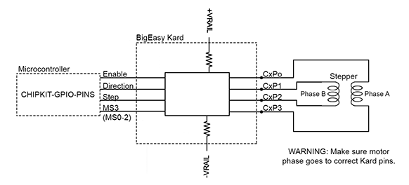 This Kard is based on the Big Easy Driver Stepper Motor Driver http://www.schmalzhaus.com/BigEasyDriver/ it allows the Quick control a bi-polar stepper motors up to 2A/phase using the four rail pins for the slot into which it is inserted.